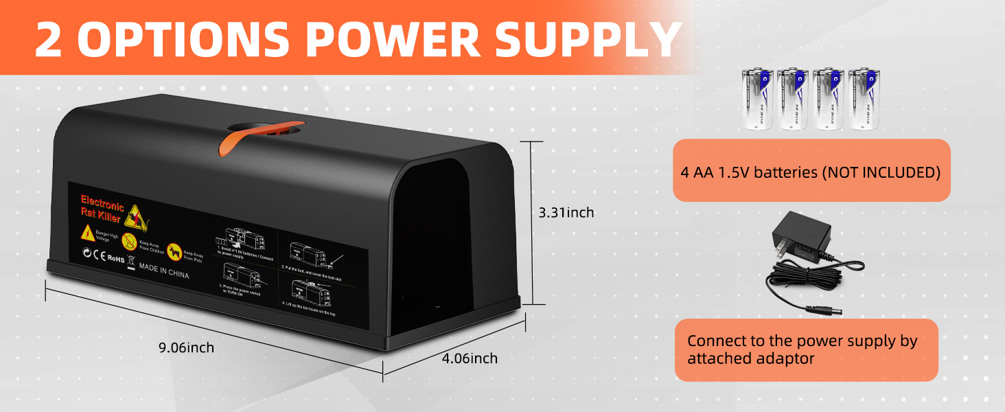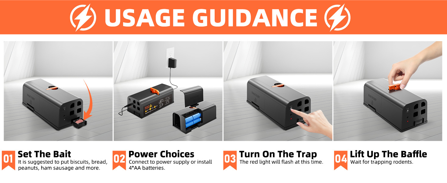 Place bait inside the device (e.g., cake, peanut butter). When a rat enters and touches the metal plate, a high-voltage shock is triggered, killing it instantly.